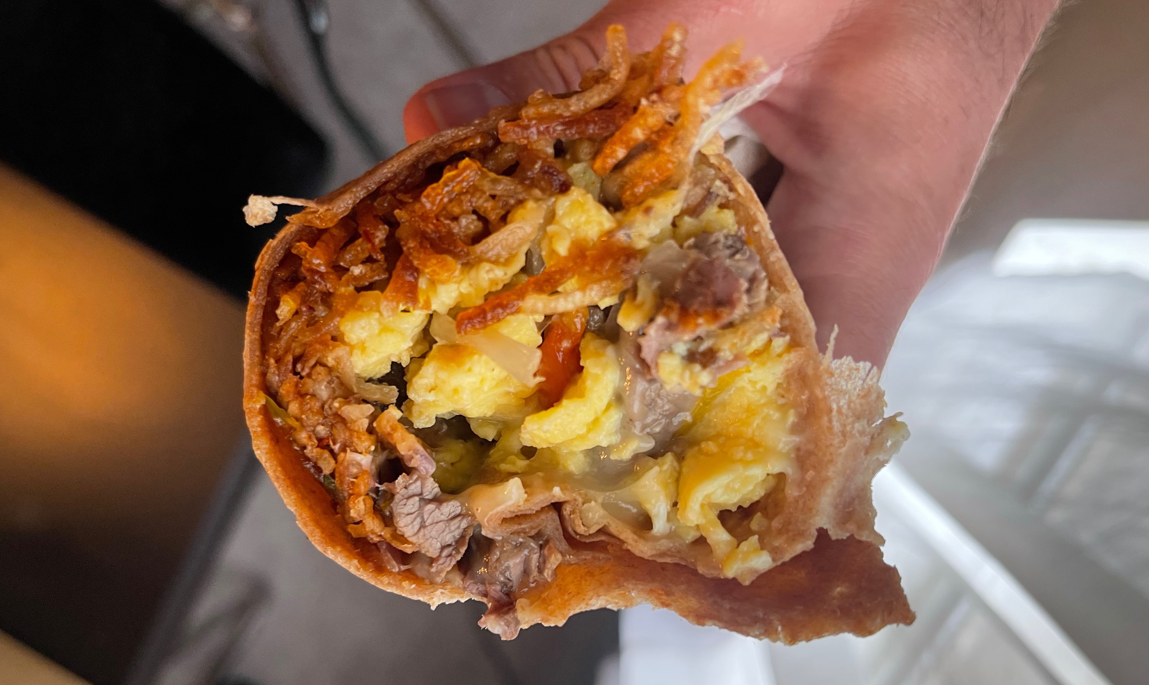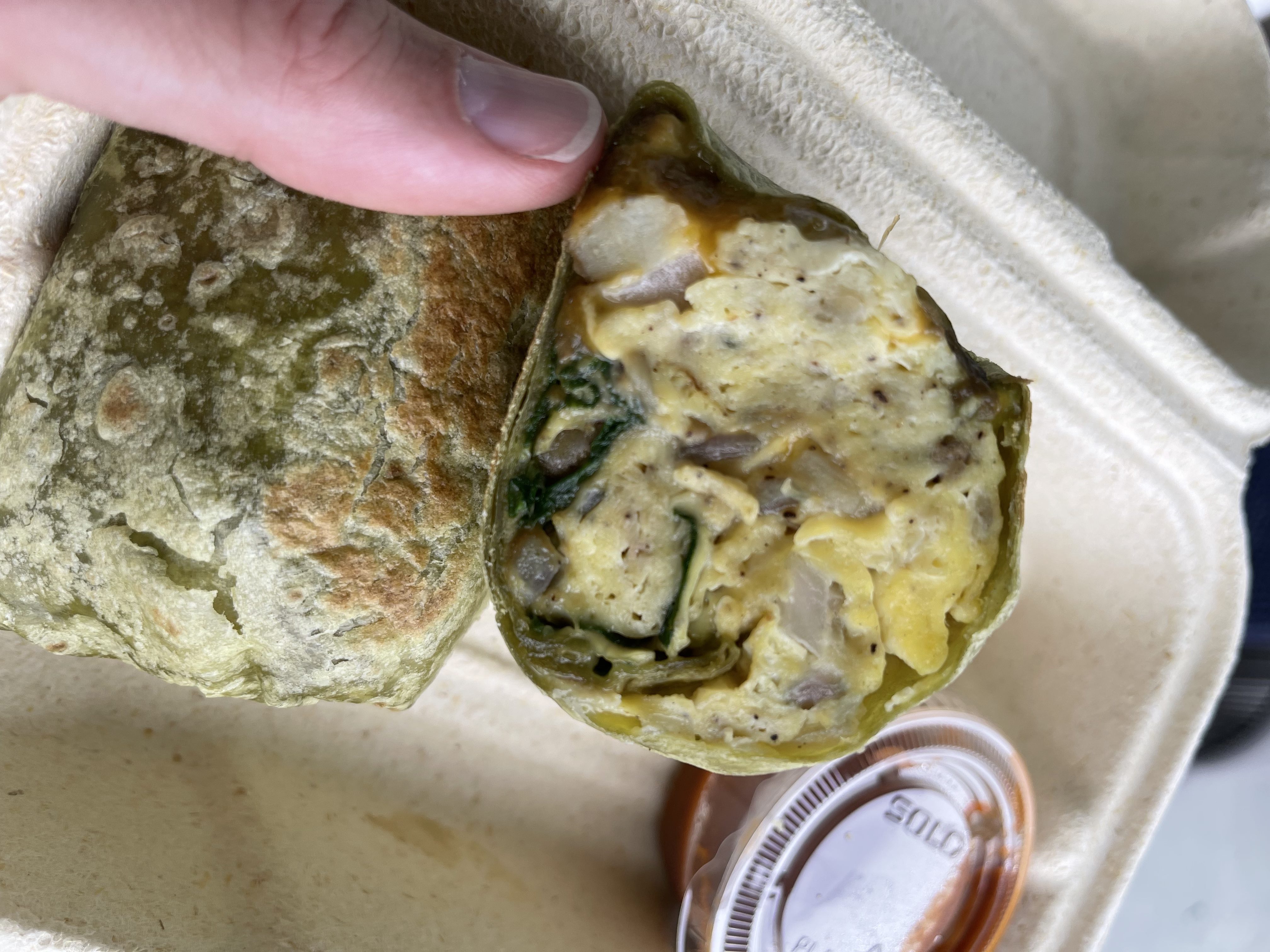 Health-oriented Hive is a high-end coffee spot where you can get acai bowls and some other foods and supplies. The burrito had organic eggs, fingerling potatoes, cheddar cheese, avocado spread, spinach, red onion in a spinach tortilla wrap. Not a great burrito overall. Not terrible, but…